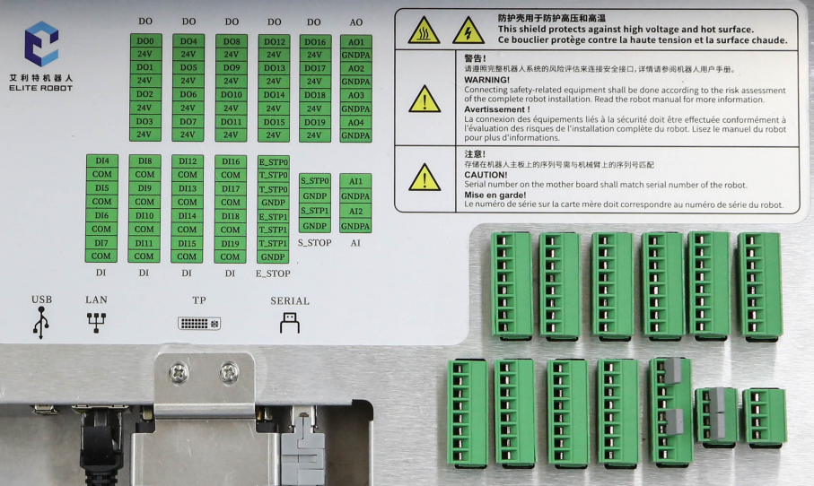 控制箱中包含數字 I/O、模擬 I/O 和所有安全 I/O ,其中E_STOP端子排為控制外部停止相關配置,S_STOP端子排為控制防護停止相關配置,如 圖 2-1 所示。