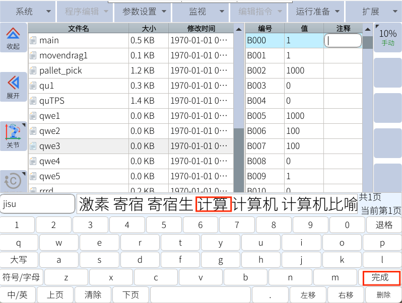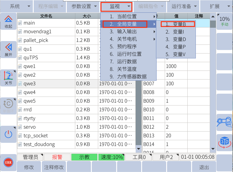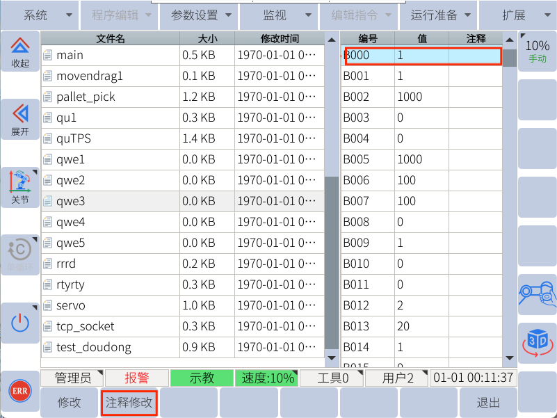 機器人在調試過程中經常會使用到全局變量和IO信號,在手動測試過程中為防止忘記變量和IO信號的功能,一般會在后面增加對應的注釋,EC示教器上的全局變量(D,B,I,V,P)均可以人為修改注釋(支持各類語言),數字IO,模擬量IO,M虛擬輸入和輸出也均支持修改注釋