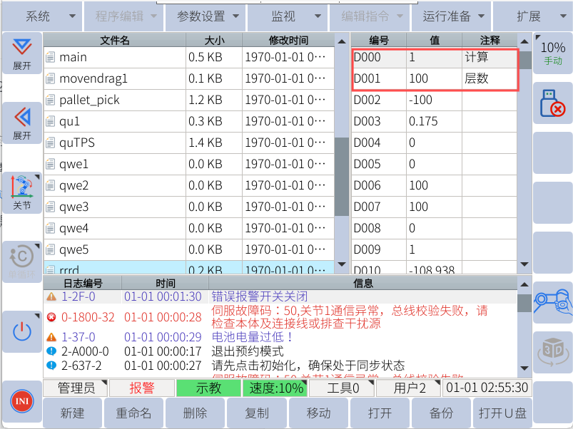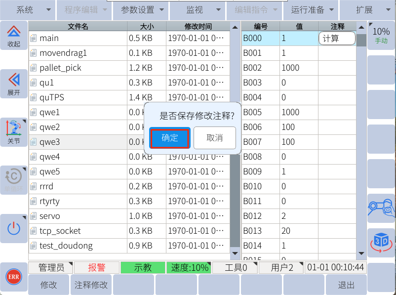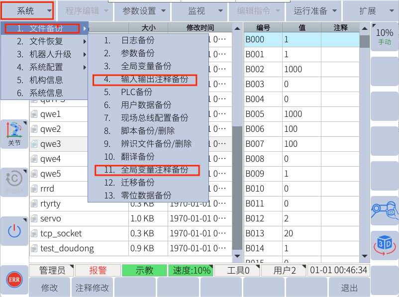 1.操作文件備份或者恢復時,示教器上無全局變量注釋或者輸入輸出注釋的選項