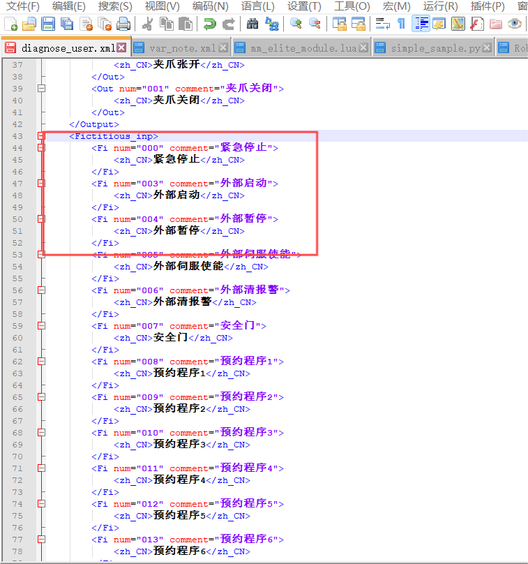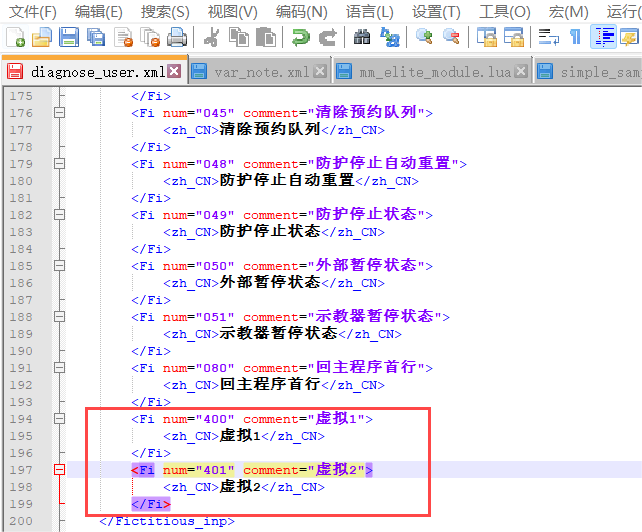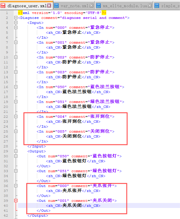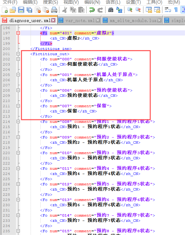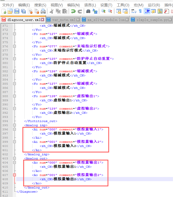 6)diagnose_user.xml文件打開后,根據需要可在文件下進行對應數字、虛擬、模擬量的輸入輸注釋修改