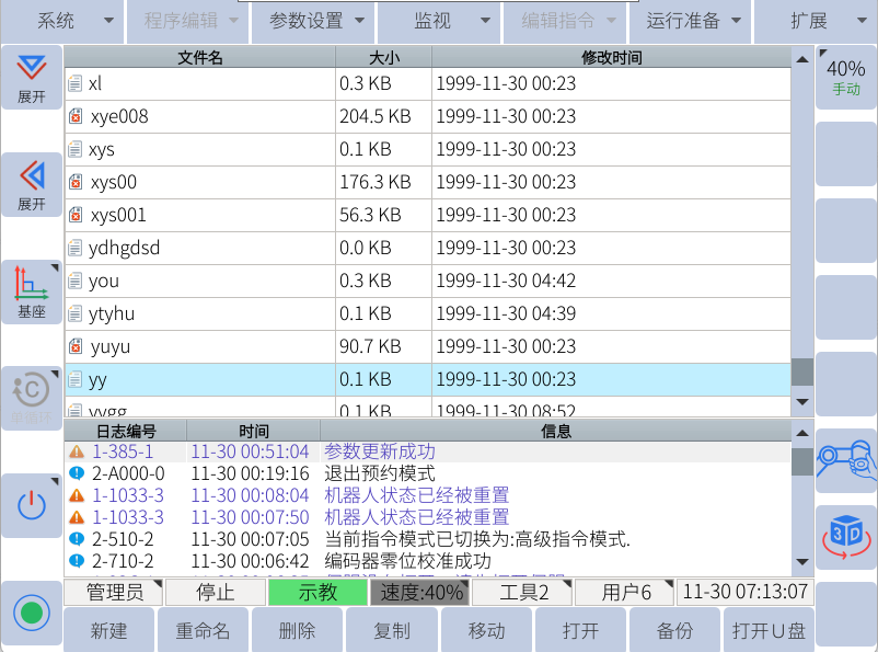 用戶plc一般只用作簡單的機器人功能配置,不能當做邏輯控制器使用,編寫復雜程序會導致無法保存。