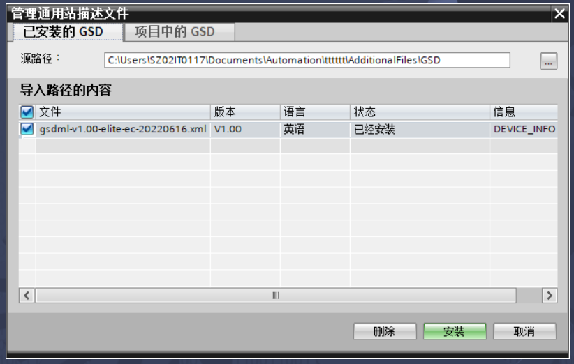 將下面鏈接的艾利特機器人GSD 文件安裝到 TIA PORTAL 中管理通用描述文件,如圖 2-2 所示。