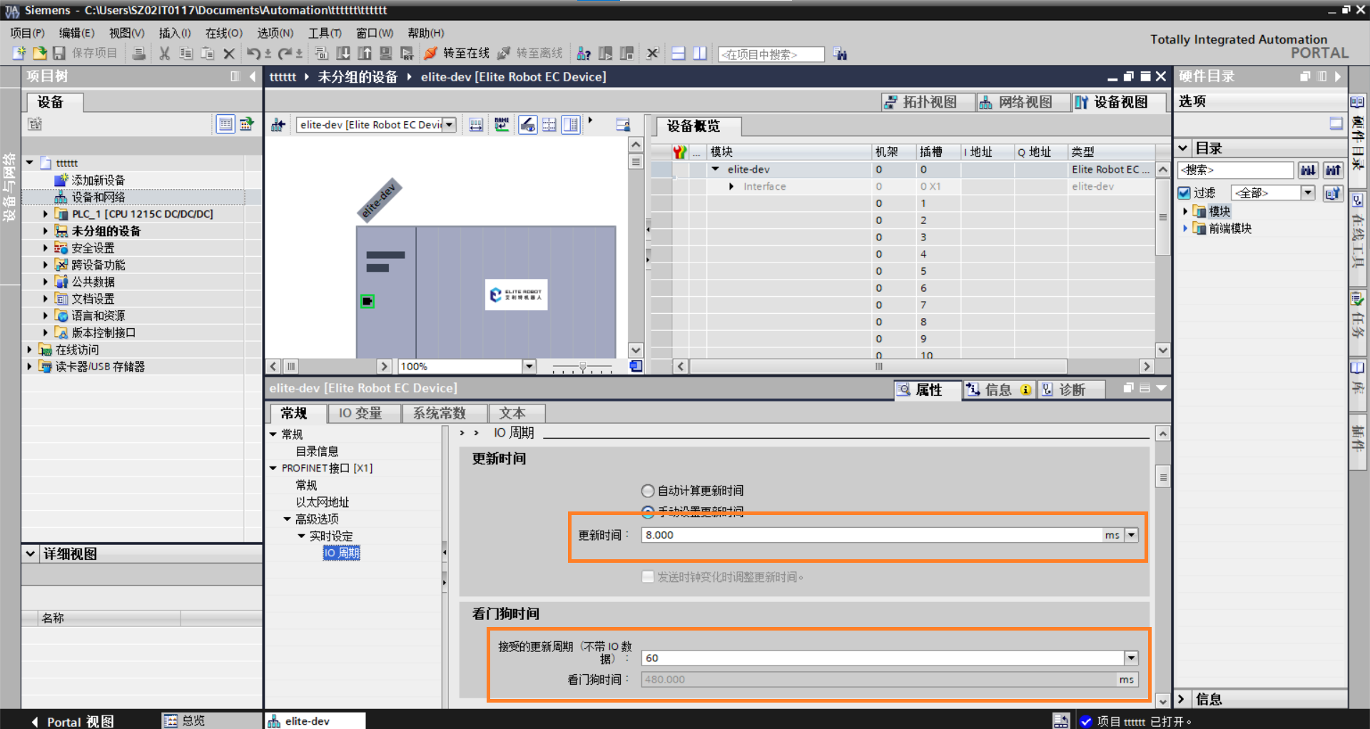 4. 雙擊 Elite Robot EC Device 設備的屬性中設置 IP 地址和 IO 周期,如下圖所示。