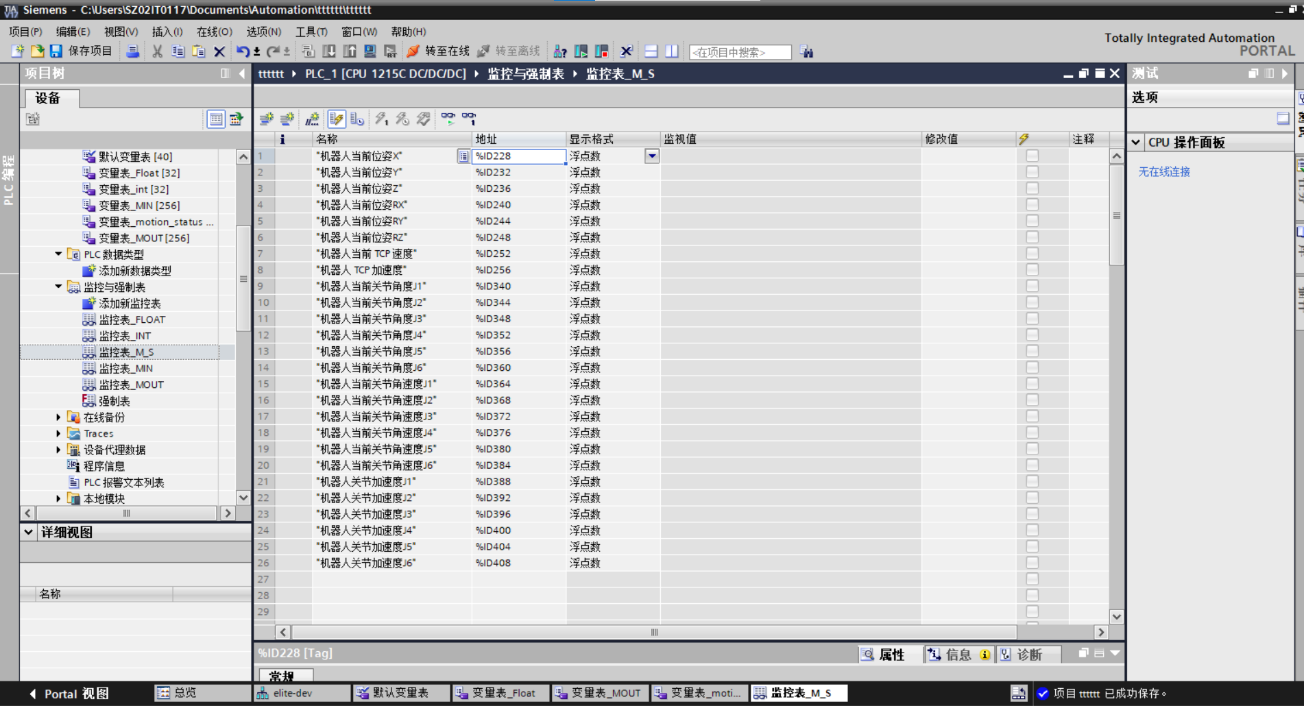 8. 添加完成之后,下入PLC,轉至在線即可開始監視機器人狀態與M變量。(32位以上要重啟機器人,否則PLC會報錯下位組件錯誤)。