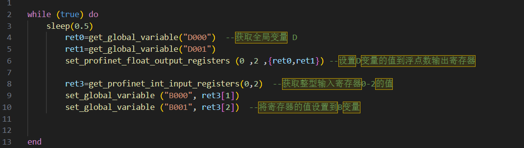 此腳本為簡單的示例腳本,機器人將D變量浮點數傳到PLC對應地址前兩個寄存器,plc將兩個正整數傳入機器人B變量。更多腳本指令,請查找EC腳本手冊profinet通訊章節。