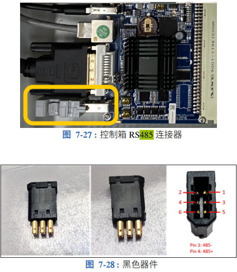 艾利特機器人EC系列支持RS485通訊,用戶可以通過將 RS485 設備連接到圖 7-27 中所示的連接器來從控制柜執(zhí)行串行通信。為了能在控制柜中設置 RS485 連接器,必須拆掉串口連接 器,并將 RS485 線焊接到黑色連接器背面的金屬觸點,如圖 7-28 所示。黑色塑料裝置的正反 面分別標有 PIN“1 3 5”和“2 4 6”。PIN3 應焊接到 RS485B,PIN4 應焊接 到 RS485A。該 接口支持的最大波特率為 500Kbps。