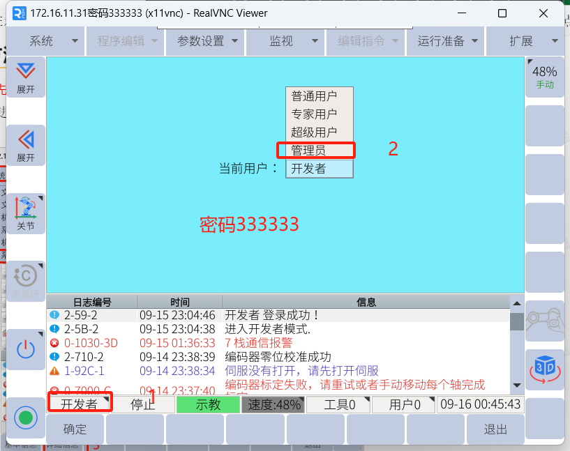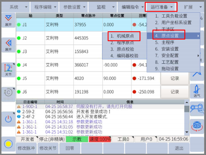 在示教器上,先切換成管理員模式,再點擊:運行準備-原點設置-機械原點,可以進入機械零點界面。
