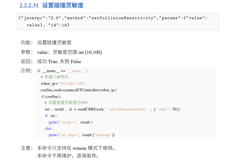 通過8055端口,發送設置碰撞靈敏度指令:{"jsonrpc":"2.0","method":"setCollisionSensitivity","params":{"value": value}, "id":id}