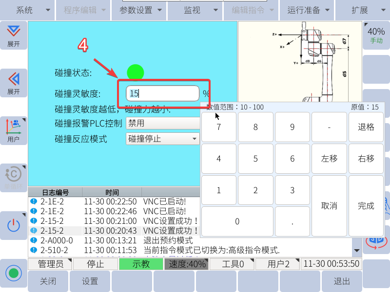 tips:機器人開啟碰撞檢測后,靈敏度設置的越小,代表機器人越靈敏,觸發機器人“碰撞檢測報警”所需要的力便越小。