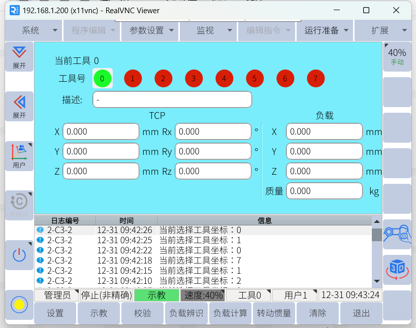 3.運行準備—工具負載設置—選擇一個工具號,左下角設置使工具號變成綠色即可打開。
