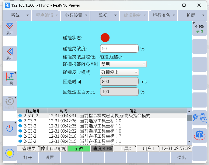 2. 設置百分比要結合機器人當前的負載,速度,姿態,例如機器人速度很快,滿負載,設置20%會導致機器人正常運行報警碰撞,推薦可以先設置50%,后續運行程序逐步更改。