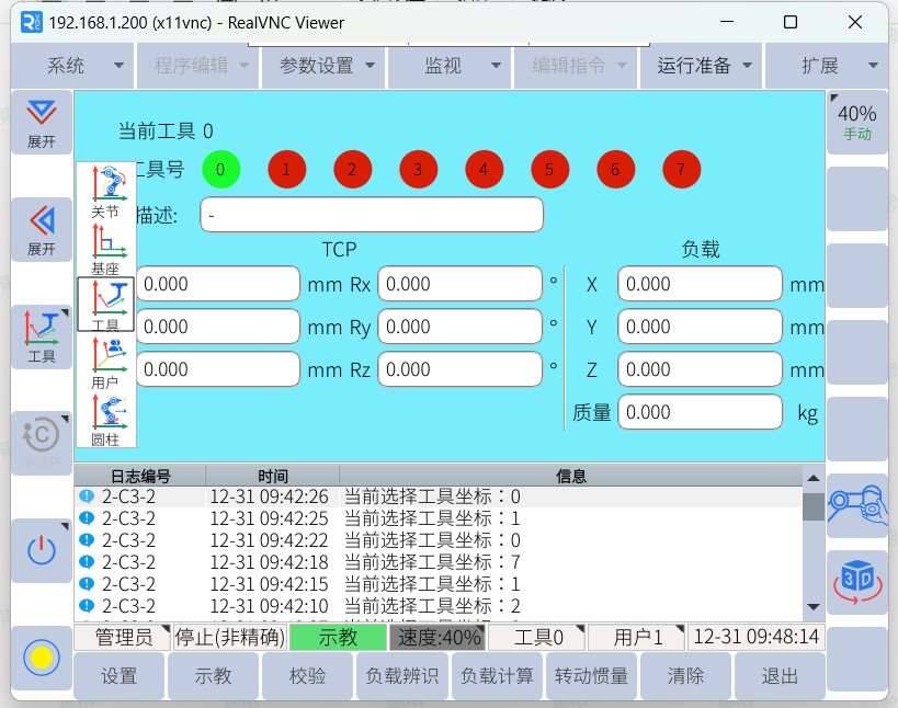 ● 將鑰匙轉至示教模式,點擊“運行準備 > 工具負載設置”,進入工具設置界面
