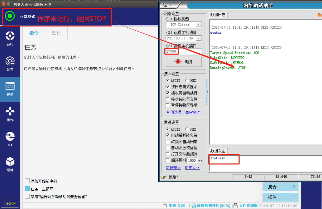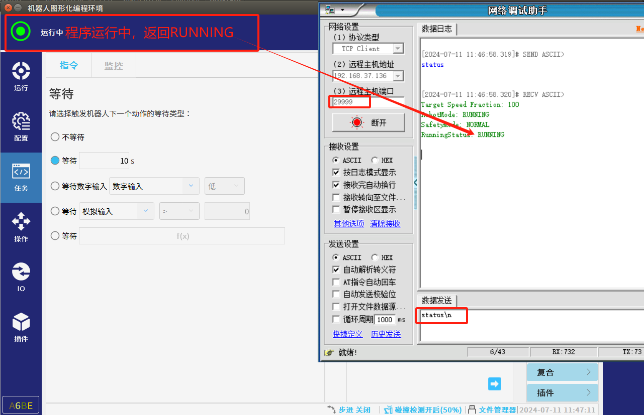 5. 建議上位機通過29999端口,發送status獲取機器人當前程序狀態:RunningStatus狀態來判斷程序是否運行,再根據實際選擇通過30001端口或通過29999端口發送新的全局變量值。