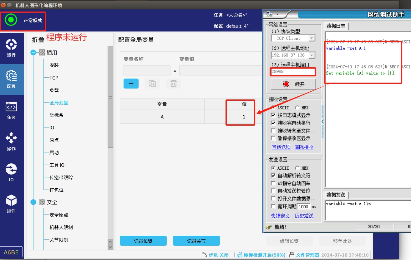 1. 程序未運行時只能通過29999端口修改全局變量,程序運行時只能通過30001端口修改全局變量。