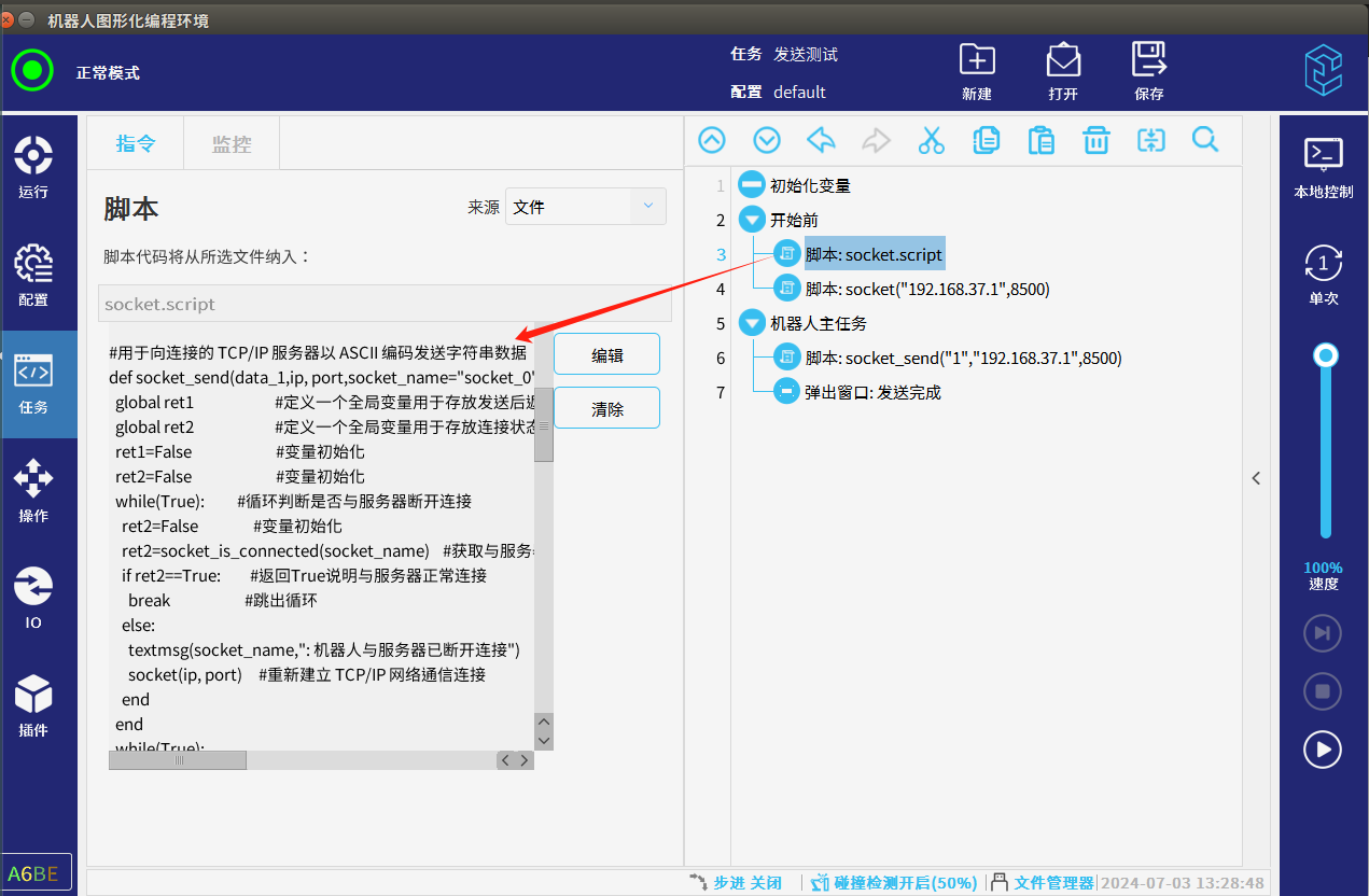 2.為了避免圖2-1的情況發生,我們可以利用發送指令的返回時作為判斷是否發送成功,發送失敗時一直發送直到發送成功為止,發送失敗的情況一般都是機器人客戶端與服務器斷開連接時出現的,所以我們可以在發送前和發送失敗后通過“socket_is_connected()”判斷與服務器連接的狀態如果斷開重新連接再次發送,如圖2-2所示,可以用下面代碼2-1配合圖2-3的圖形化編程直接調用df腳本實現此操作。