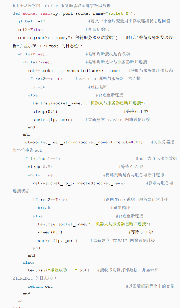 - 以上代碼是以發送字符串和讀取字符串為例,如果想發送/讀取其他數據類型,只需要更換代碼中的socket_send_string/socket_read_string即可,具體指令參考CS機器人腳本手冊下載中心_機器人技術-艾利特機器人
