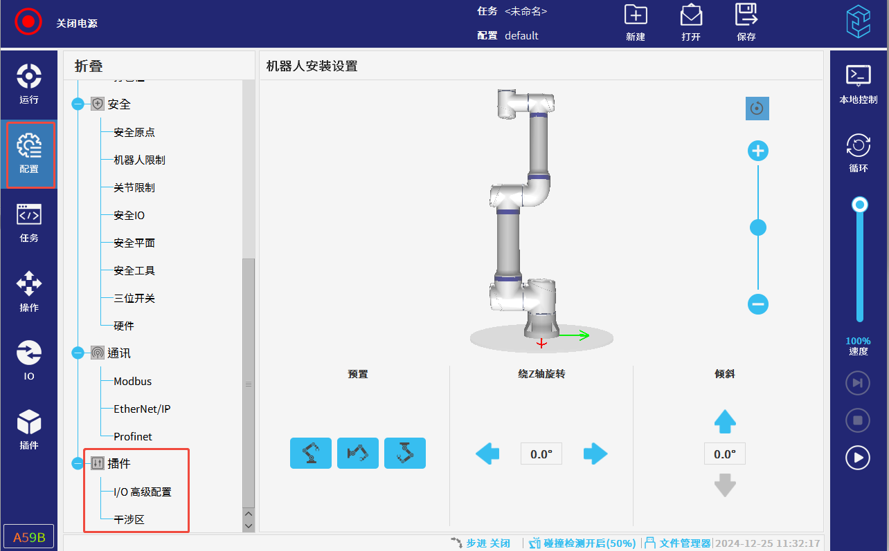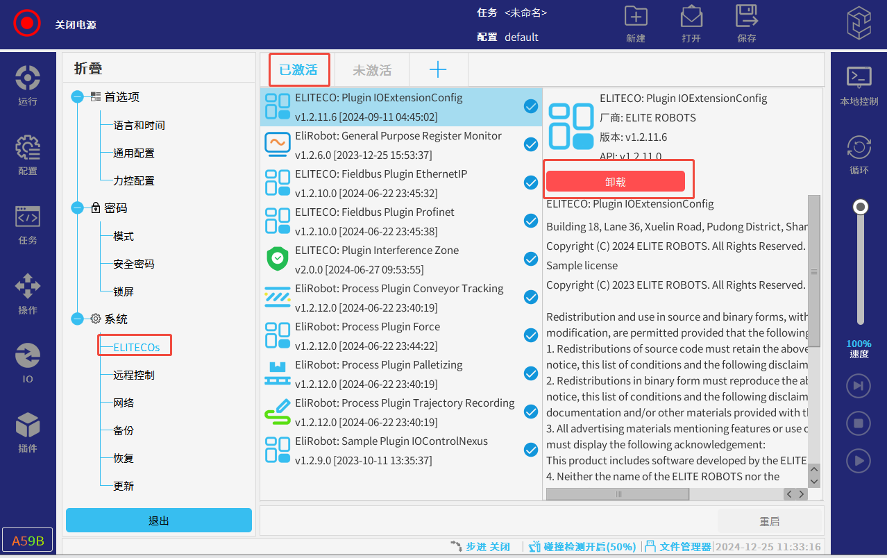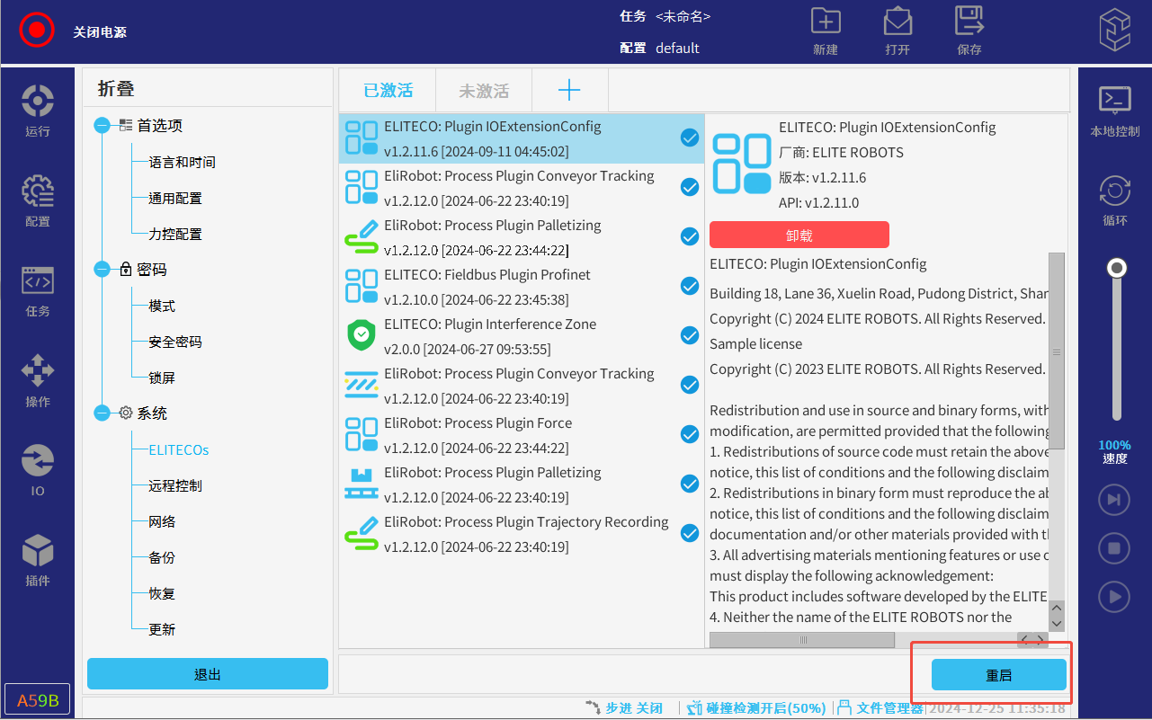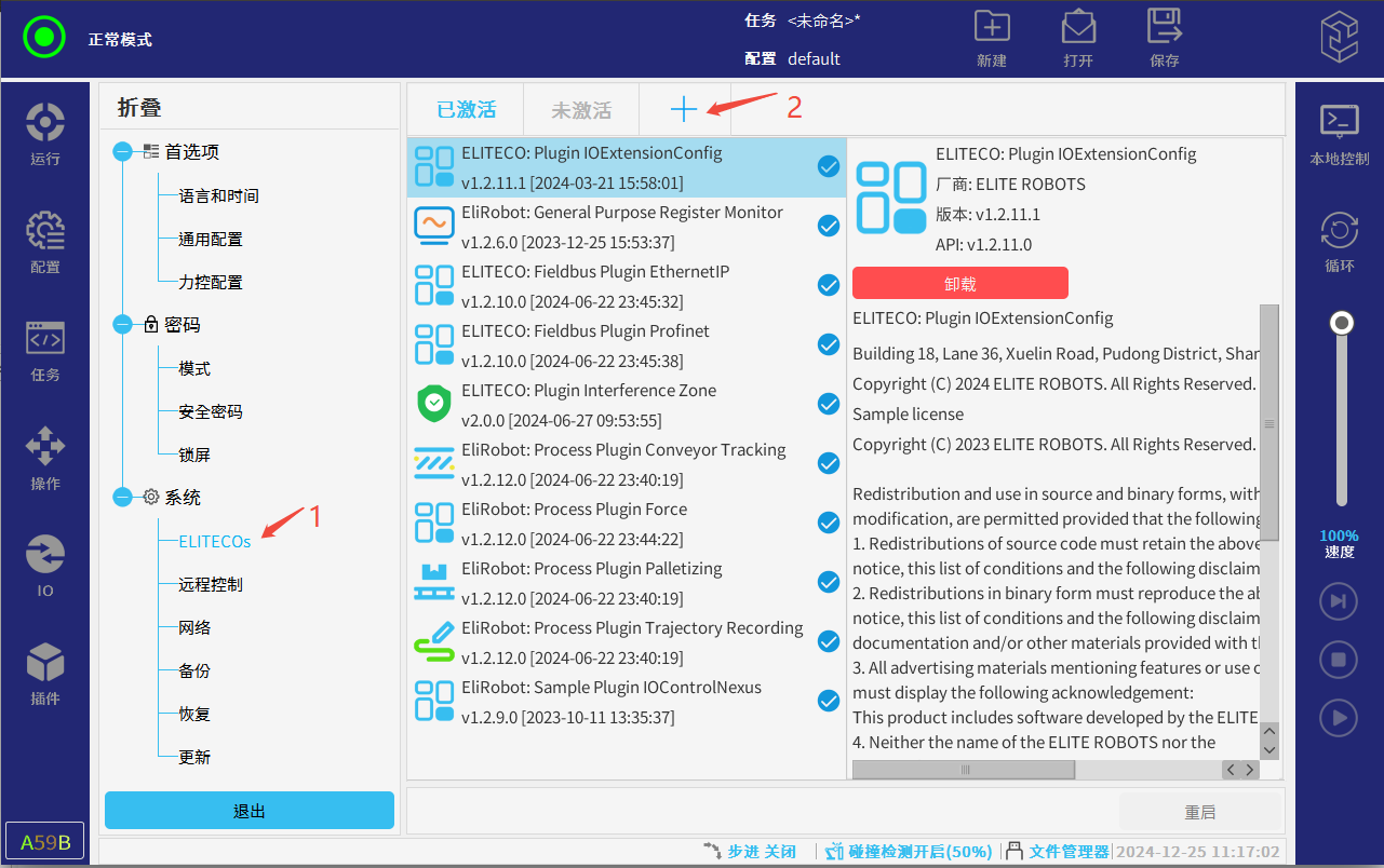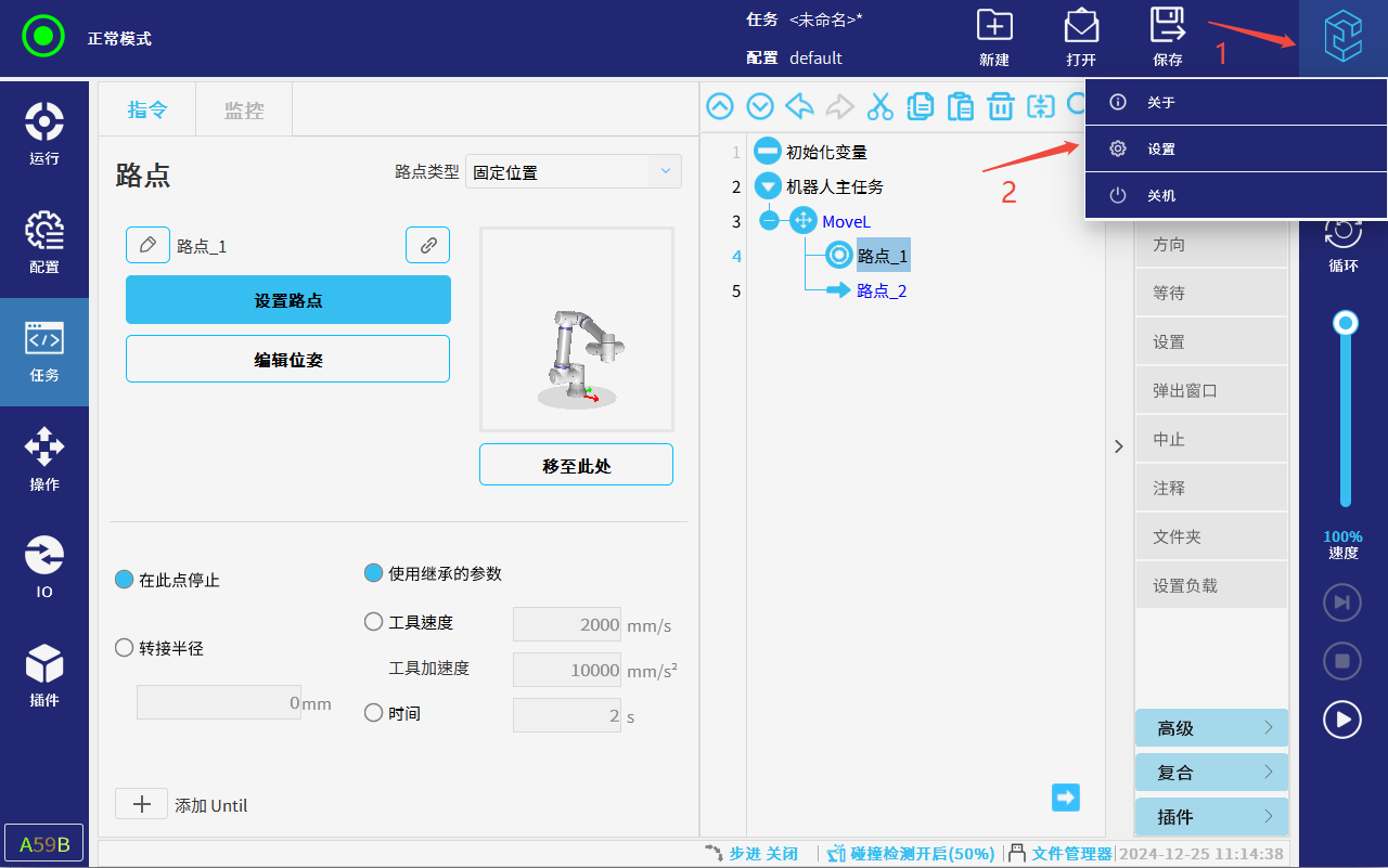 把插件放在U盤插入示教器U盤接口,點擊右上角ELITE圖標,再點擊設置(需要的相應插件請聯系ELITE技術人員)