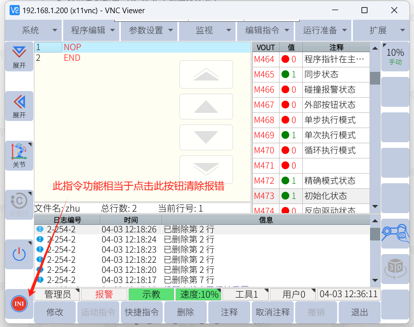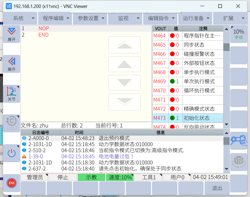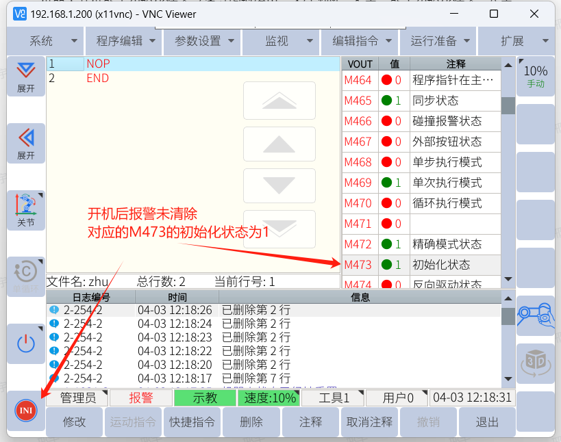 機器人開機處于初始化狀態(通過虛擬輸出 m473 判斷,1 表示未完成初始化狀態,0 表示完成初始化狀態),指令函數可使用getVirtualOutput。