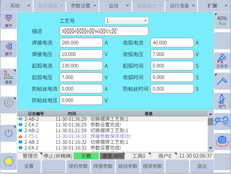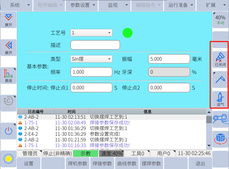 直到這個時候,焊接配置已經完成,這個時候可以點擊左側圖標觀察能否手動出絲,送氣。