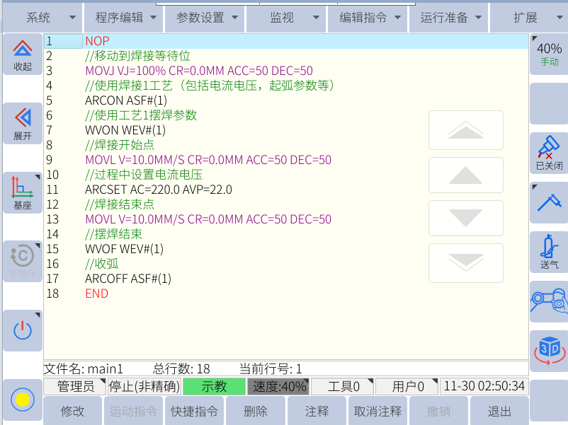 1.預備送氣:在運行焊接指令時先打開送氣,直到達到設定時間后開始起弧。