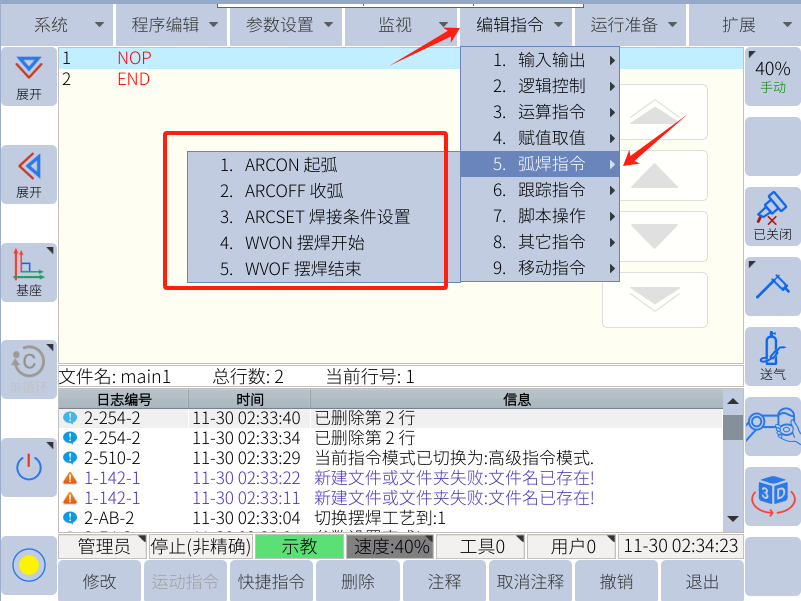1.ARCON起弧:調用指定工藝號焊接參數中起弧的電流電壓等參數。
