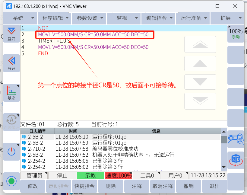 當(dāng)CR不為0 ,且后面有延時(shí)或者條件等待時(shí),機(jī)器人會(huì)轉(zhuǎn)彎時(shí)快速停止 ,就可能造成抖動(dòng)或者出現(xiàn)其他報(bào)警 ,長(zhǎng)期這樣也會(huì)對(duì)減速器損傷。如圖所示:
