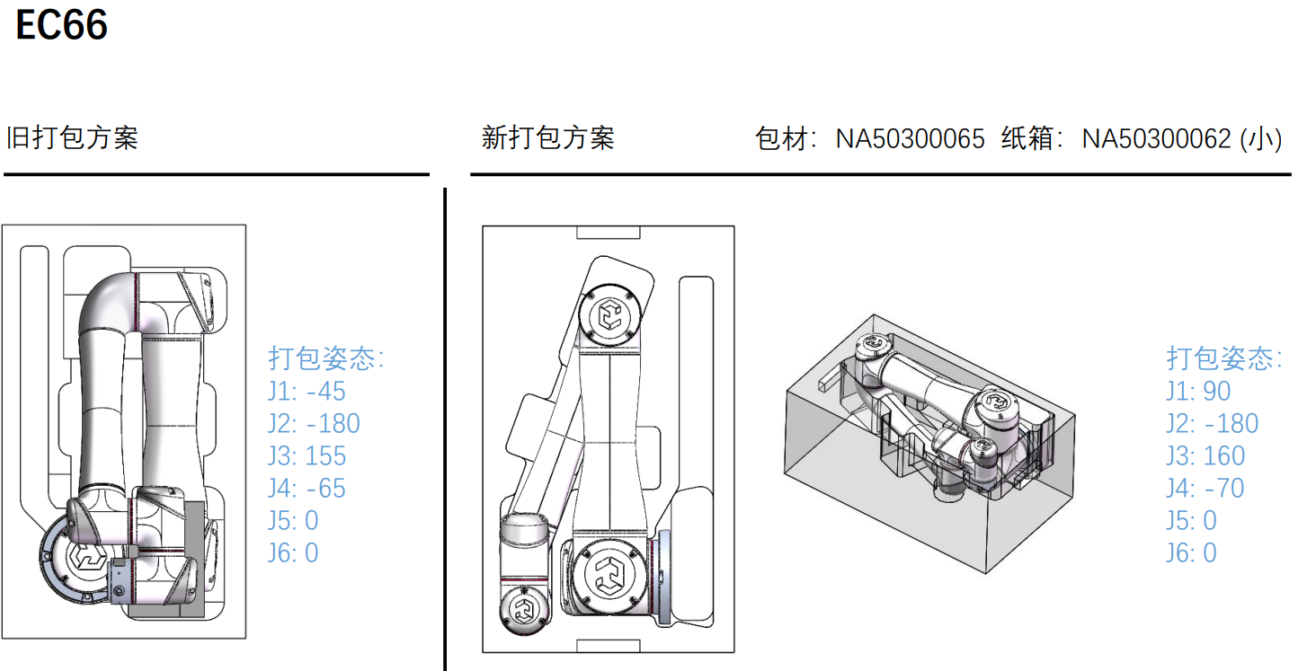 4. 運(yùn)輸過程中需要機(jī)器人的2、3軸不要受力,有支撐,合理的打包姿態(tài)運(yùn)輸能能夠有效的避免機(jī)器人抖動(dòng)。打包姿態(tài)如圖:
