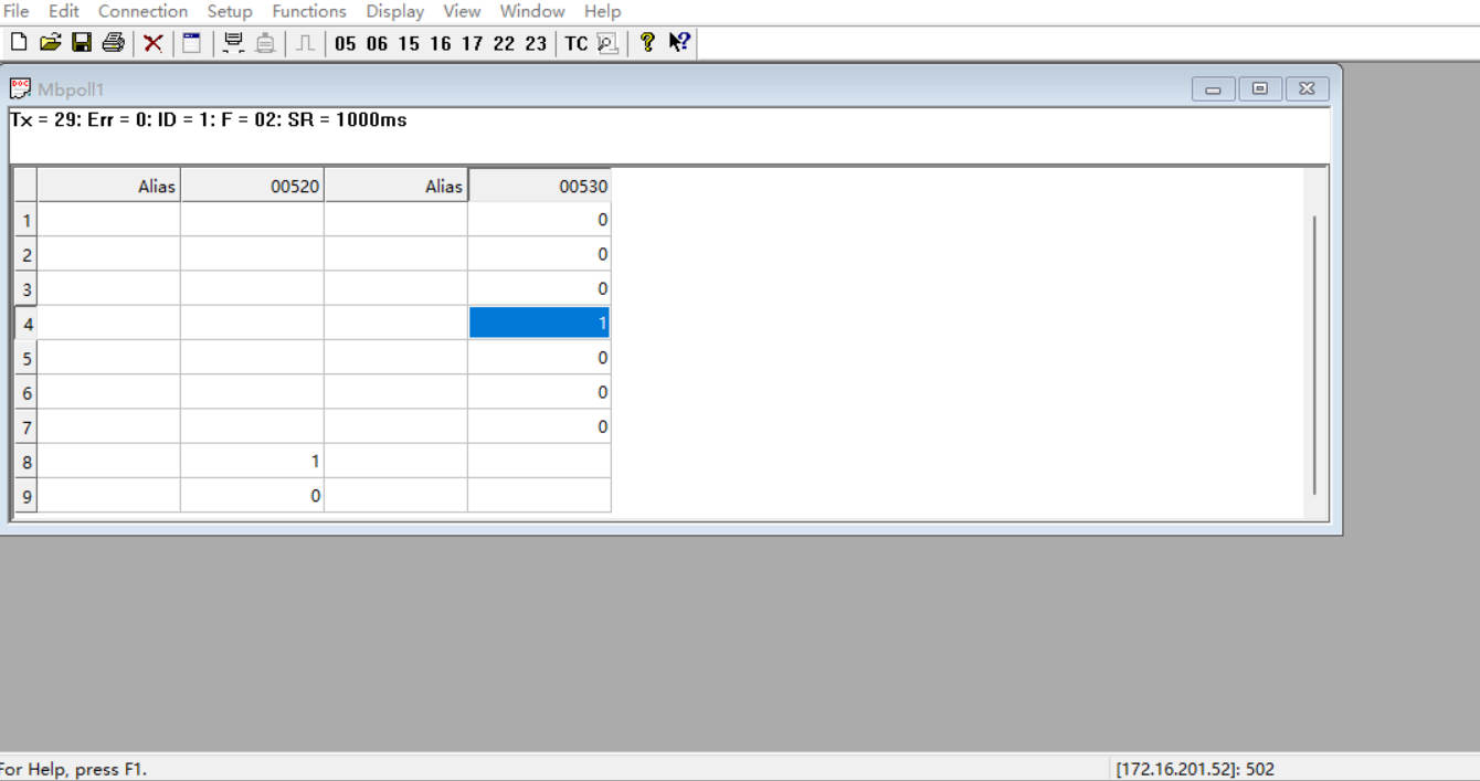 助手端將400寄存器設置為123,401寄存器設置為23,402寄存器設置為-345,403寄存器設置為-876,404寄存器設置為2345