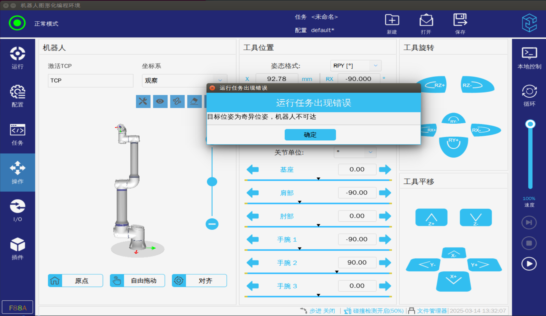 機器人奇異點是指機器人在特定姿態或關節位置下,其運動學模型出現數學矛盾,導致無法通過逆運動學計算得到唯一解或可控解的現象,這種現象源于機械結構的幾何約束和運動學方程的退化,可能引發運動不穩定、關節速度突變或自由度喪失等問題。