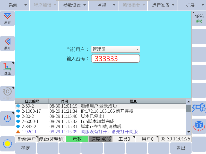 tips:機器人開啟碰撞檢測后,靈敏度設置的越小,代表機器人越靈敏,觸發機器人“碰撞檢測報警”所需要的力便越小,碰撞檢測是檢測電流的大小,靈敏度設置過高,易引發碰撞報警誤報,可根據實際情況,設置合適的靈敏度值。
