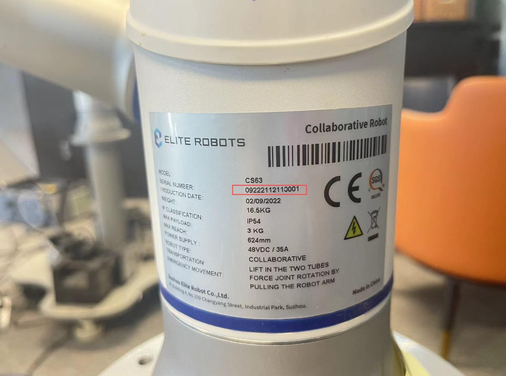 步驟1:首先確定機械臂本體的序列號和控制柜的序列號是否匹配,機械臂本體的序列號在1關節標簽處,控制柜序列號在控制柜右側標簽處。如下圖: