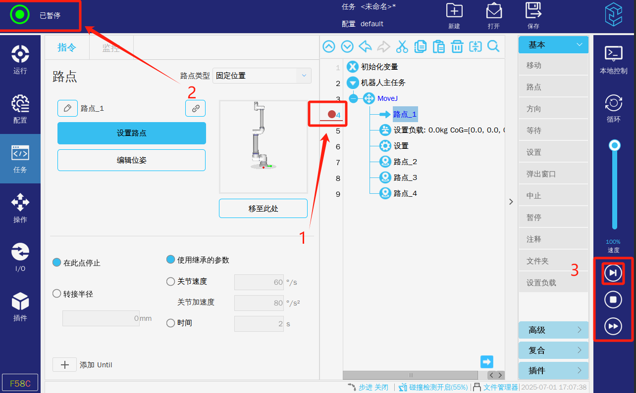 1. 在任務(wù)里選擇需要單步的語(yǔ)句行,選擇“基本”