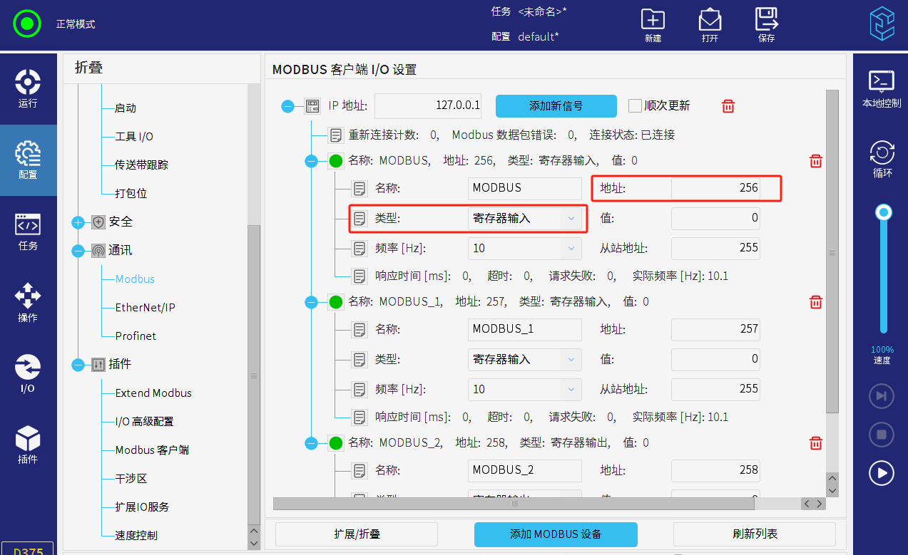 機器人示教器配置--通訊--modbus--添加modbus設備,輸入ip(127.0.0.1屬于機器人內部mudbus從站內部地址),設置每個信號名稱、類型、地址。
