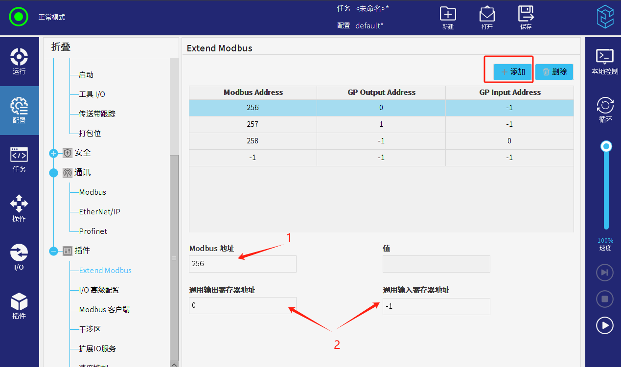在配置 > 插件 > ExtendModbus,添加modbus寄存器,通用寄存器的映射。modbus可以使用的范圍是256-383,通用整型寄存器的范圍是0-47