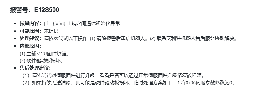 其它報警代碼也可以同樣理解,具體報警代碼及處理方式請參考FAQ,地址鏈接