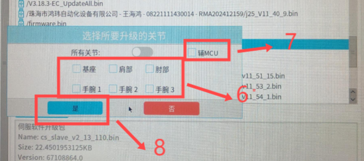 ● 點擊更新后,會彈出如下的對話框。選擇對應”關節”,勾選輔MCU,并點擊”是“,等待升級完成即可。(主MCU升級與輔MCU操作方式一致,但不能勾選輔MCU)