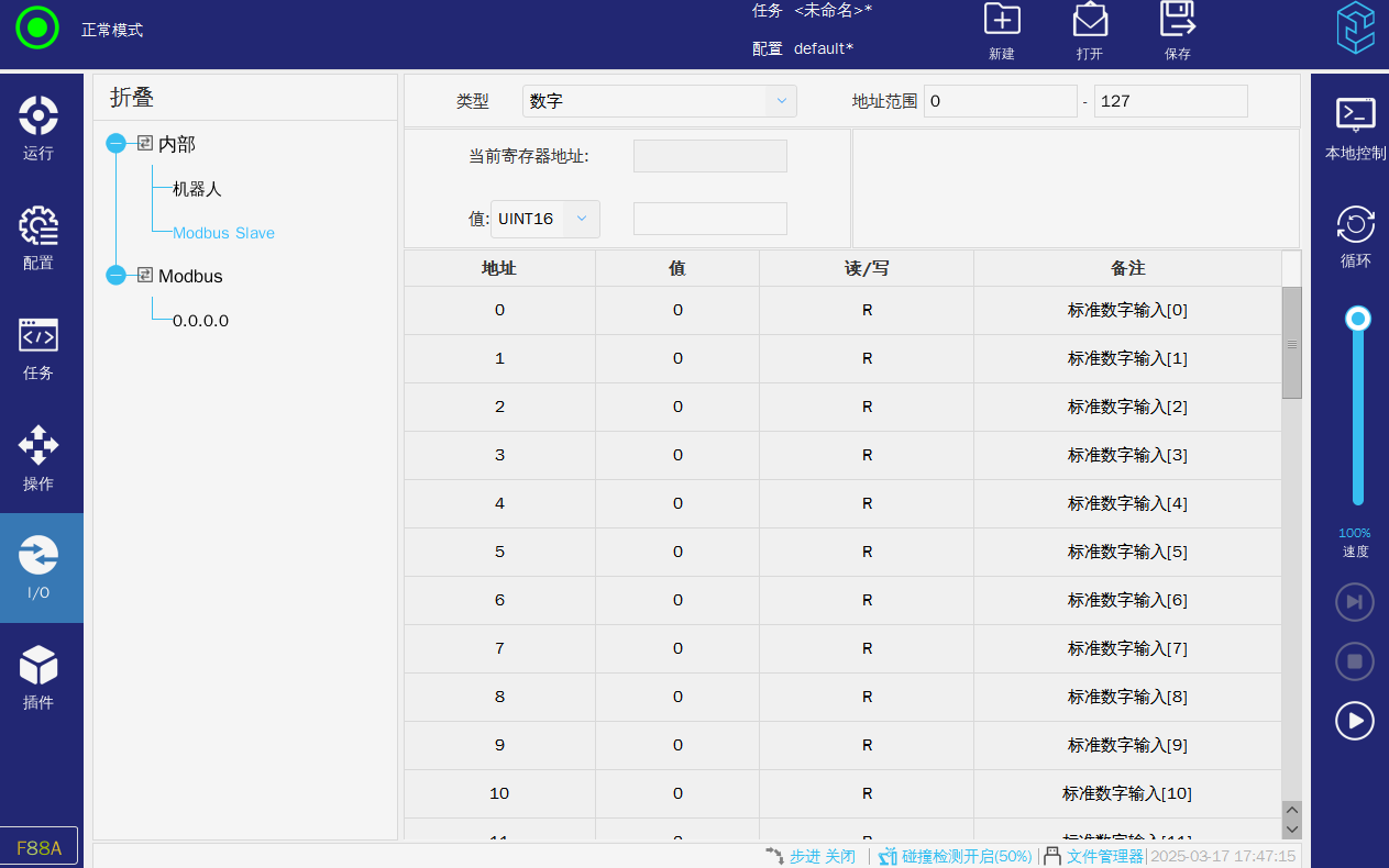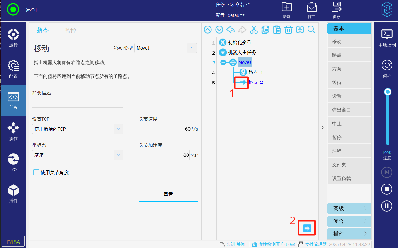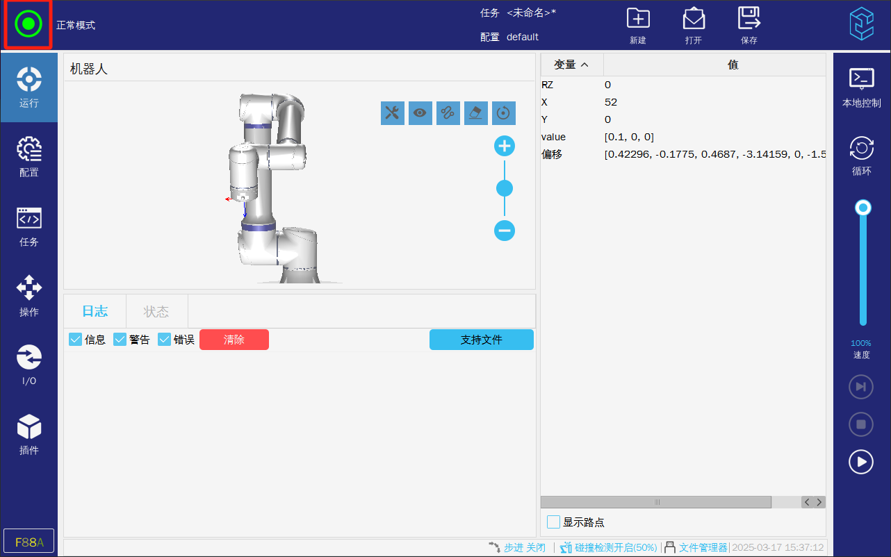 2.運(yùn)行模式,如果是正常模式則需要讓任務(wù)運(yùn)行(左上角處于“運(yùn)行中“),則機(jī)器人才會(huì)根據(jù)任務(wù)來(lái)執(zhí)行需要?jiǎng)幼鳌?/p>