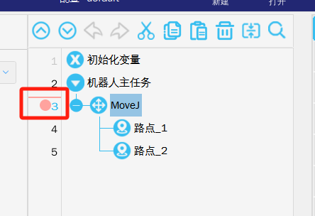在處于任務(wù)運(yùn)行中的時(shí)候機(jī)器人如果沒(méi)有任何動(dòng)作也無(wú)報(bào)警可以查看對(duì)應(yīng)任務(wù)的程序指針,通過(guò)指針查看當(dāng)前程序執(zhí)行在哪一行(比如以上程序目前是在處于等待指令行),由此來(lái)判斷不動(dòng)作的原因。位置1是程序指針,如果找不到位置1的程序指針,可以點(diǎn)擊位置2,該位置是表示跟蹤到程序指針位置1.