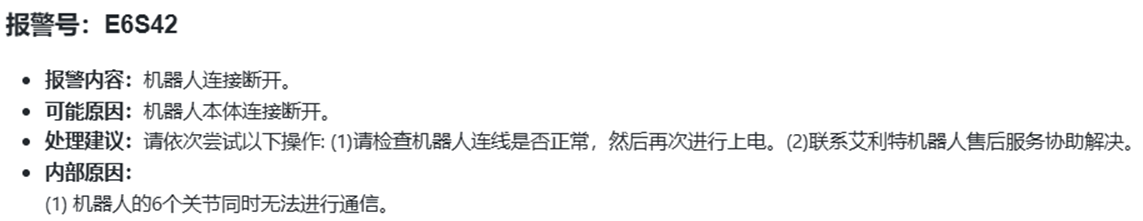 E6S42 報警所指示的是:機器人連接斷開。其具體釋義如下: