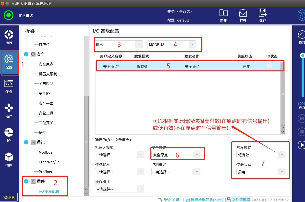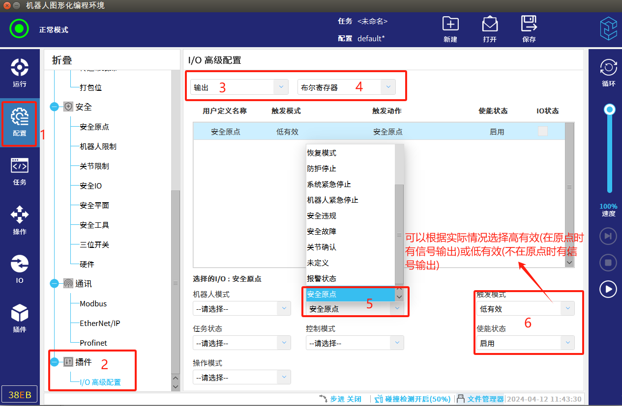 3. 配置modbus信號為安全原點信號輸出,要求:應用版本要求2.11及以上,IO/高級配置插件版IOExtensionConfig-1.2.11.1及以上(modbus通訊機器人作為主站時建議使用)