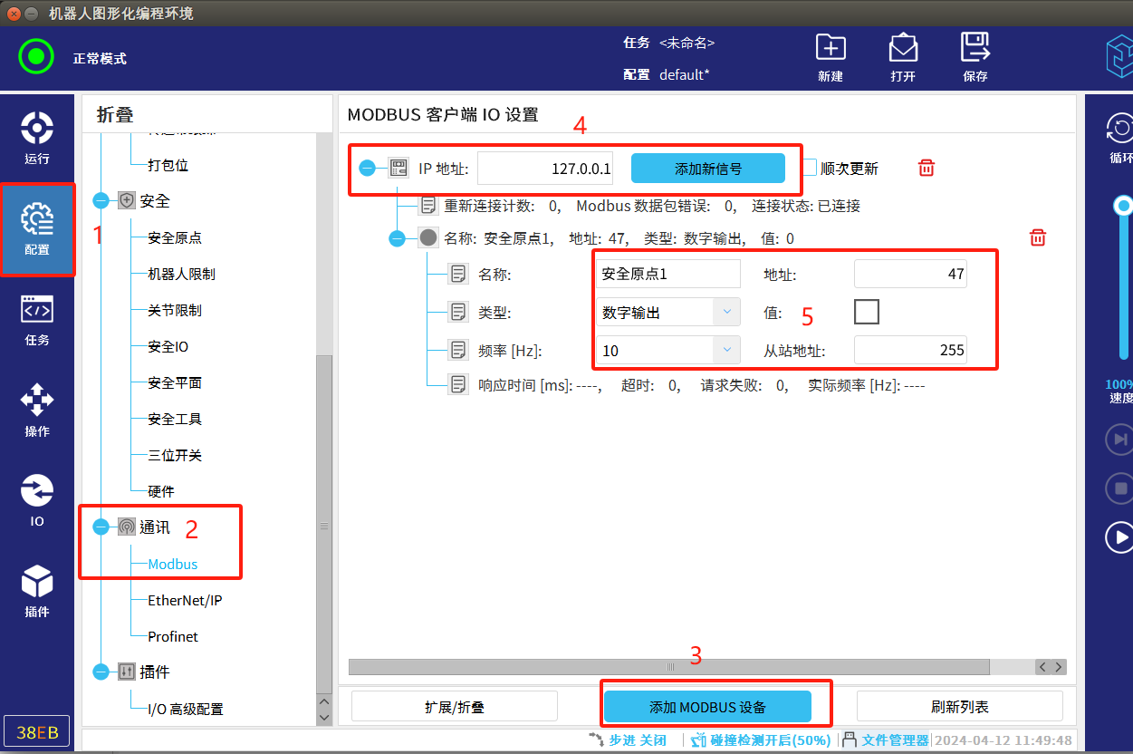 4. 通過IO/高級配置插件配置modbus信號為安全原點信號輸出時需要先添加modbus信號才能在配置界面顯示。