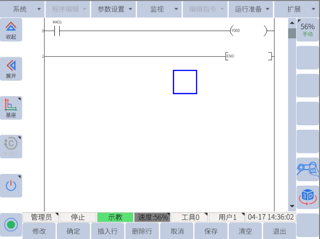 機(jī)器人進(jìn)入管理員權(quán)限(密碼:333333),導(dǎo)航到擴(kuò)展 -> 用戶PLC,使用梯形圖關(guān)聯(lián)M401和需要輸出的數(shù)字IO