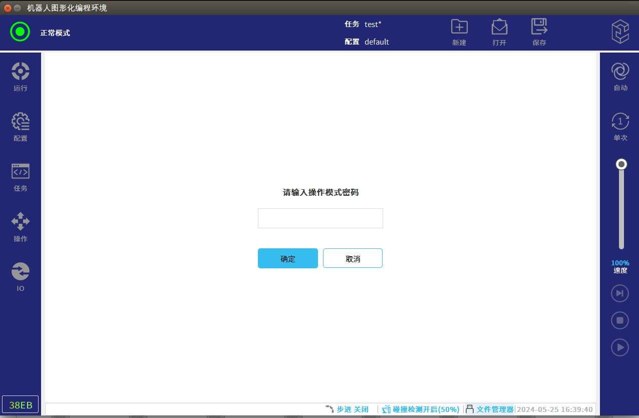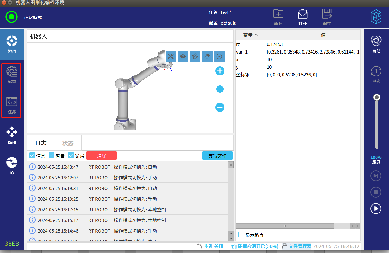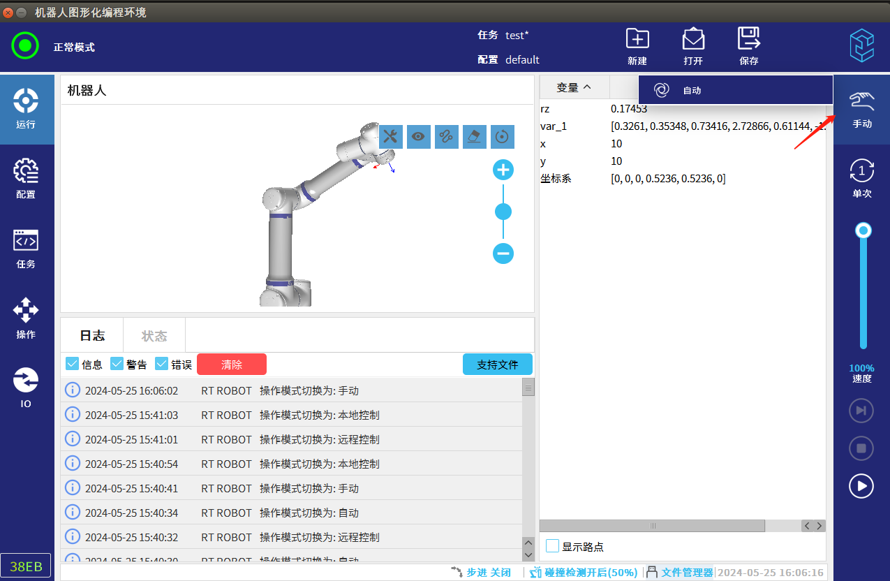 在切換成自動模式時,出于安全考慮是無法查看及修改機器人的程序以及配置狀態的,如需修改則需要重新切換成手動模式