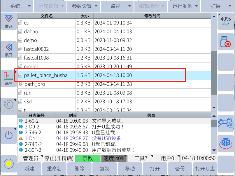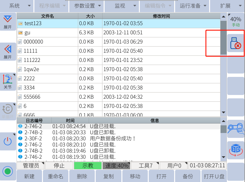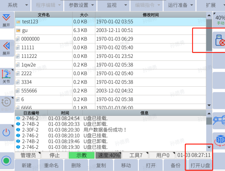 檢查示教器屏幕左上方是否彈出u盤圖標,