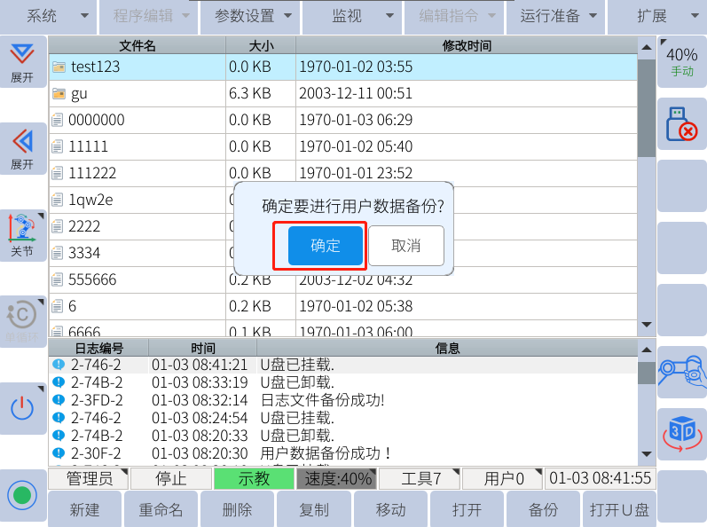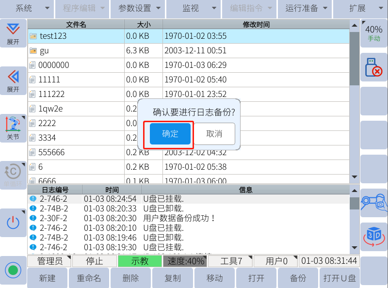 在u盤插好的情況下,點擊:系統--文件備份--日志備份--確認