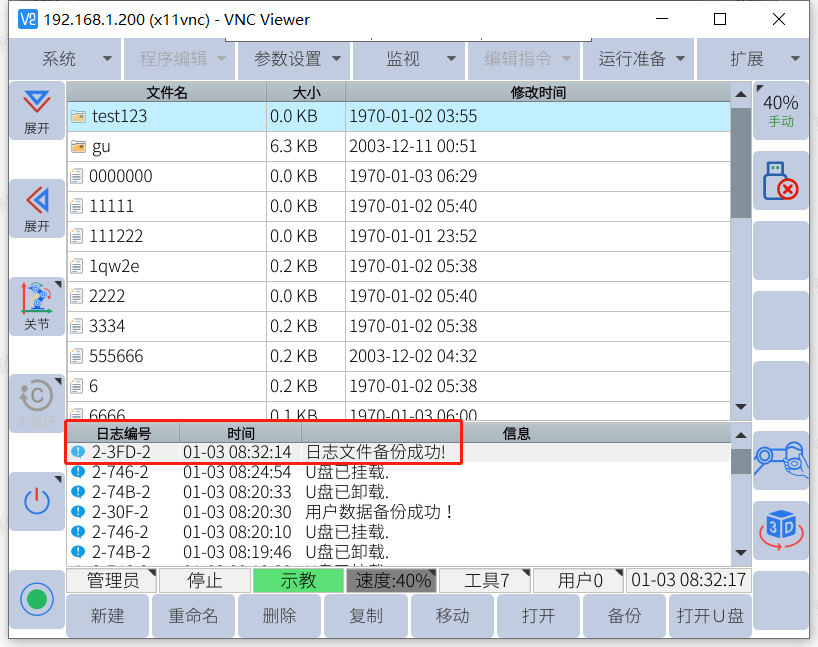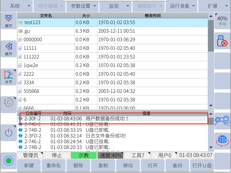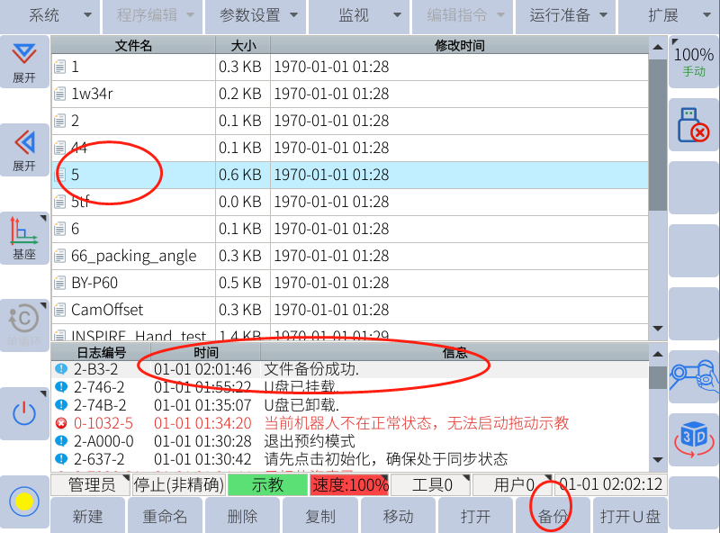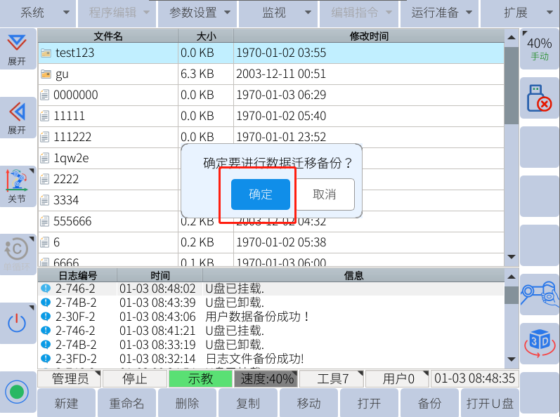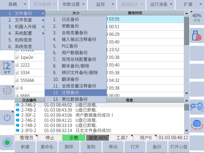 遷移備份一般在需要更換控制柜的情況下使用,會備份出所有的機器人文件包括機器人的零位dh等,需要注意不能和用戶數據備份弄混!