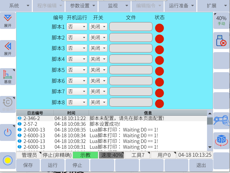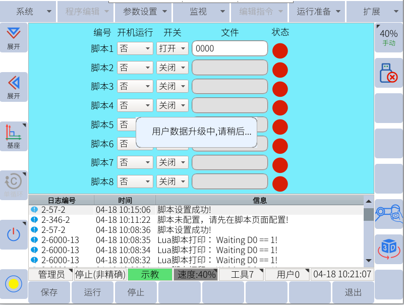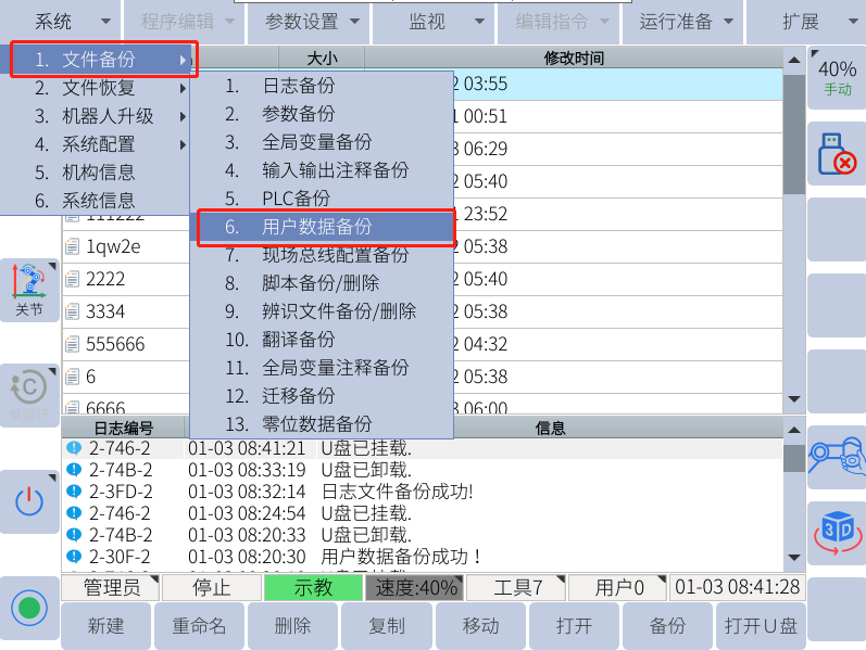 用戶數據備份可備份出所有jbi和lua文件,也包括用戶plc,全局變量及注釋等;一般復制一臺機器人應用的程序到另一臺機器人的時候,可以使用用戶數據備份;