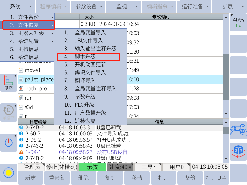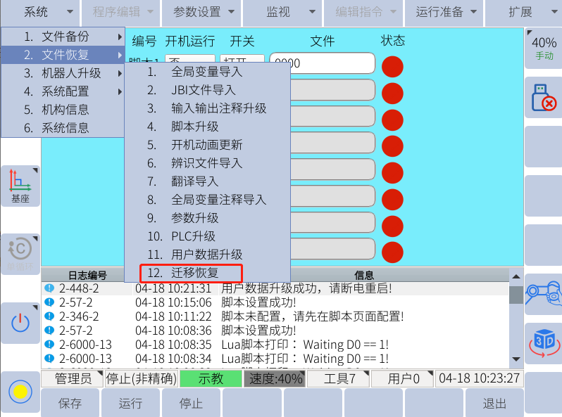遷移恢復一般在需要更換控制柜的情況下使用,會備份出所有的機器人文件包括機器人的零位dh等,需要注意不能和用戶數據恢復弄混!否則會出現丟失零點等不可挽回的問題!(遷移只能在同臺機器人內進行,,不同臺機器人,不能遷移恢復)