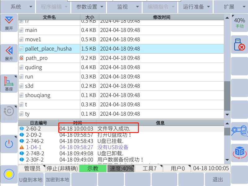 注:只有示教器上顯示u盤圖標的時候才能用來備份和恢復(導入導出相關數據)