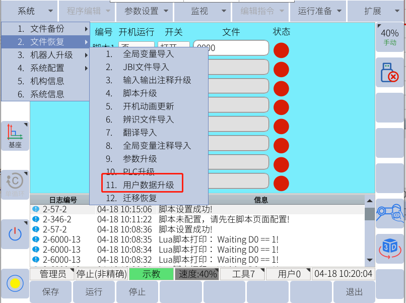 用戶數據恢復可恢復出所有jbi和lua文件,也包括用戶plc,全局變量及注釋等;一般復制一臺機器人應用的程序到另一臺機器人的時候,可以使用用戶數據恢復(不包含全局變量);